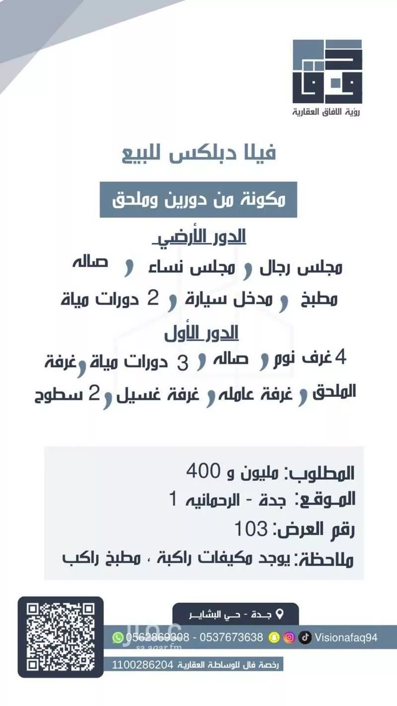 تصفح 37 فلل للبيع في البشائر، جدة. قارن الأسعار من 1,300,000 إلى 2,000,000 ريال، بمتوسط 1,622,432 ريال.