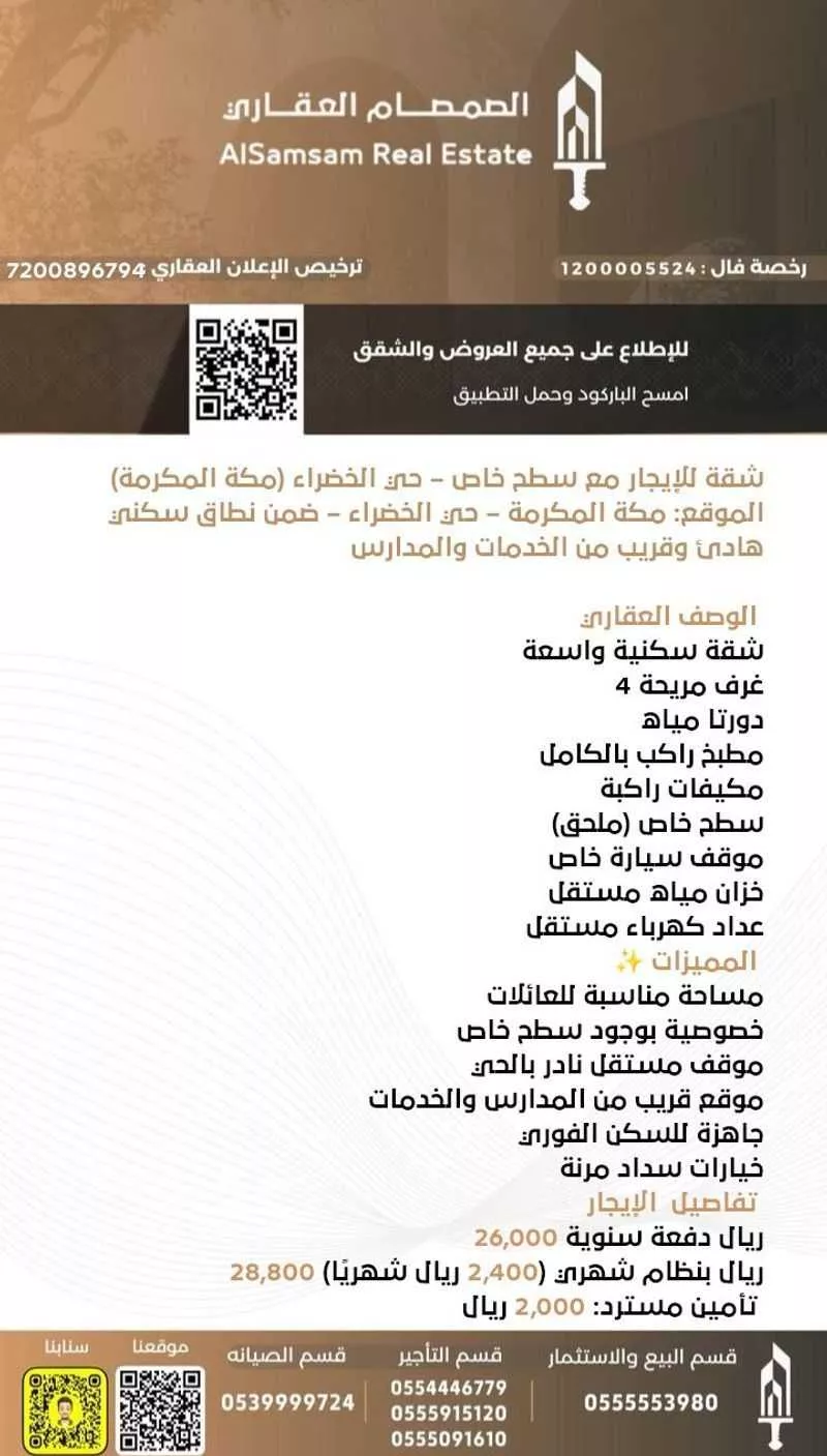 متوسط الإيجار السنوي شقق في الخضراء هو 28,800 ريال (2,400 ريال/شهر)، بناءً على 24 إعلان نشط عبر أكثر من 13 منصة على دارك. هذا أعلى بـ 7% متوسط مكة البالغ 27,000 ريال سنوياً.