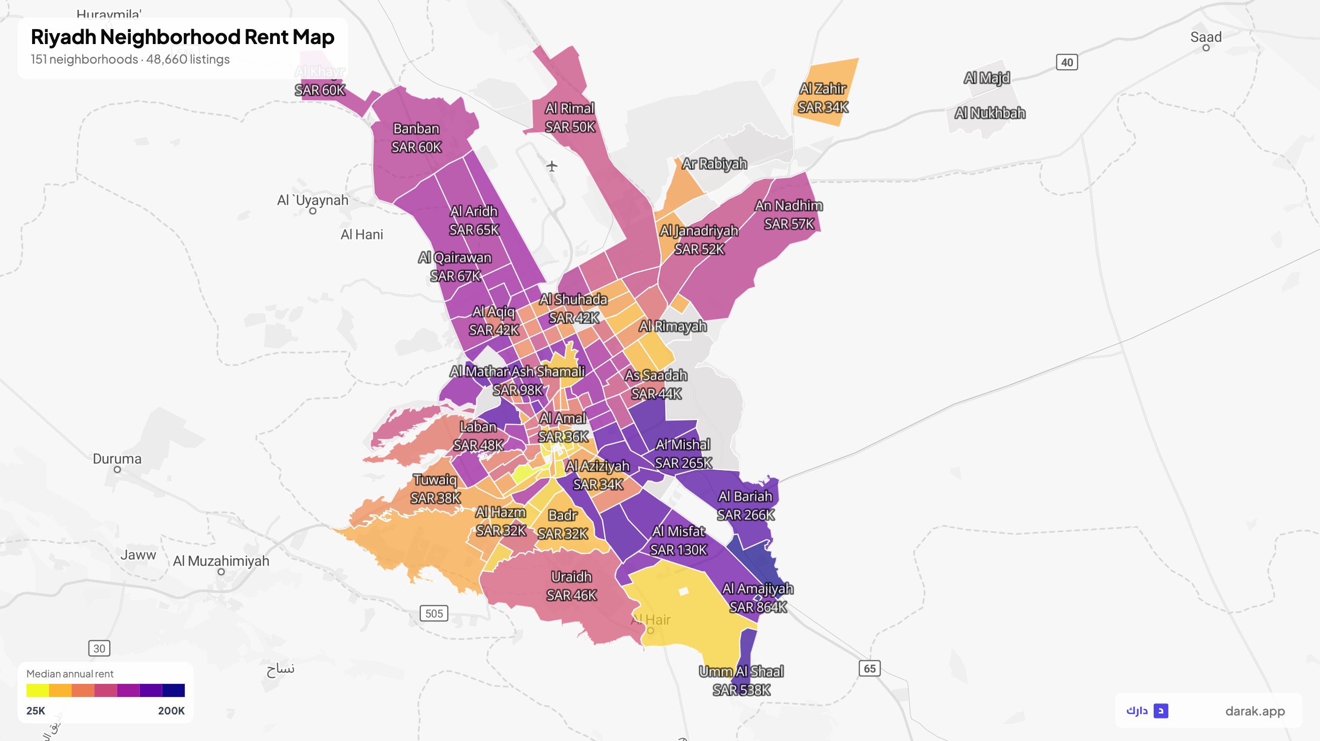بدأنا بـ ٢٠٠ حي فيهم اعلانات شقق للايجار على دارك، مسحوبة من ١٣+ منصة عقارية سعودية تشمل عقار وبيوت وبروبرتي فايندر وحراج. فلترنا على الاحياء اللي فيها ١٥ اعلان على الاقل (الحد الادنى الاحصائي لمتوسط موثوق)، ثم رتبناهم بمزيج من عمق المعروض ونسبة السعر للمساحة وتغطية الخدمات.