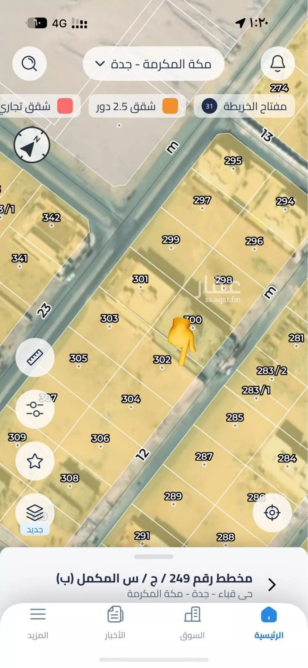 عرض على Aqarللبيع قطعه أرض سكنيه في مدينه جده مخطط طيبة ب 249/ ج / س ( منح الدكاتره) رقم القطعه ( 302) مساحه / 1200 م شارع /16 شرقي الاضلاع / 30 على الشارع في عمق 40 موقع ممتاز ومرتفع وفي تبة .. المطلوب/ 2 مليون ...