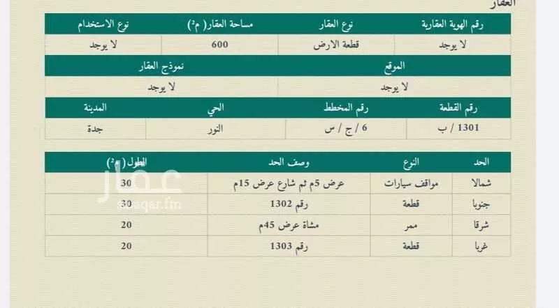 عرض على Aqarلبيع ارض في مخطط النور 6/ج /س بالقرب من جامعة الاعمال والتكنولوجيا مساحة 600م شارع شمال 15م +5م ممر . شرق ممر مشاة بطول 45م مطلوب 1200000 مرفق كافة التفاصيل