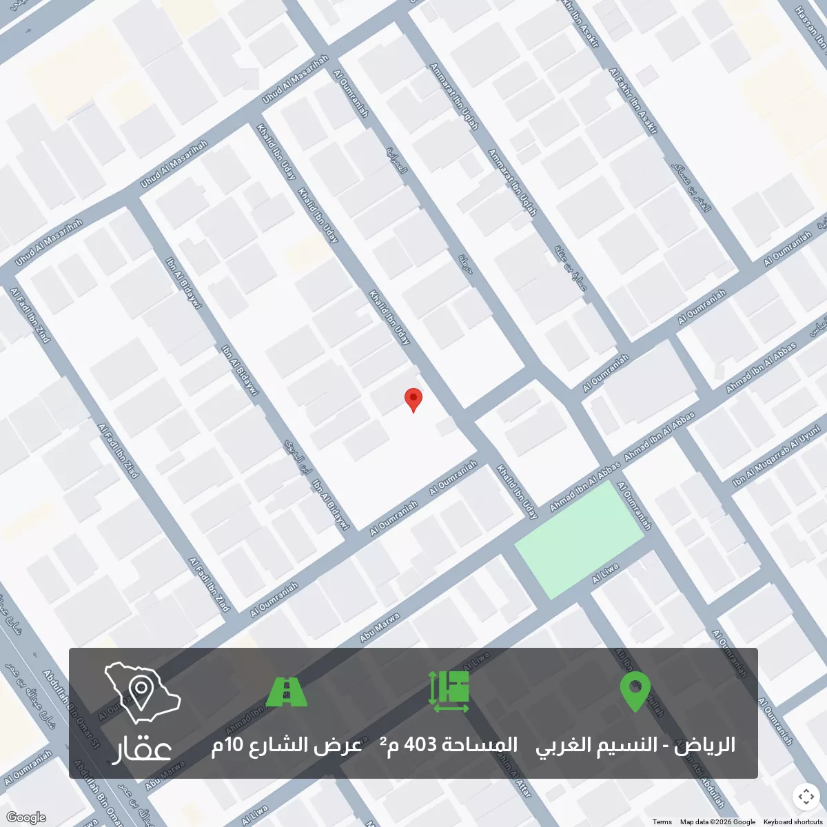 عرض على Aqarللاستفسار جوال 0547733226 لراغبي الاستثمار العقاري وبناء الأدوار المفروزة أرض سكنية قريبة من شارع حسان بن ثابت( النخيل ) المساحة ٤٠٣ متر يوجد رخصة بناء حديثة دورين وشقة بالسطح شارع ١٠م شرقي الاطوال ١٢...