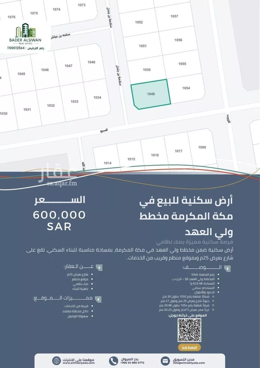 عرض على Aqarعرض تسويقي – عربي أرض سكنية للبيع في مكة المكرمة – مخطط ولي العهد فرصة مميزة لبناء فيلا في موقع منظم وقريب من الخدمات، تقع الأرض على شارع بعرض 25م مع صك شرعي وجاهزة للبناء. السعر: 600,000 ريال رقم الق...