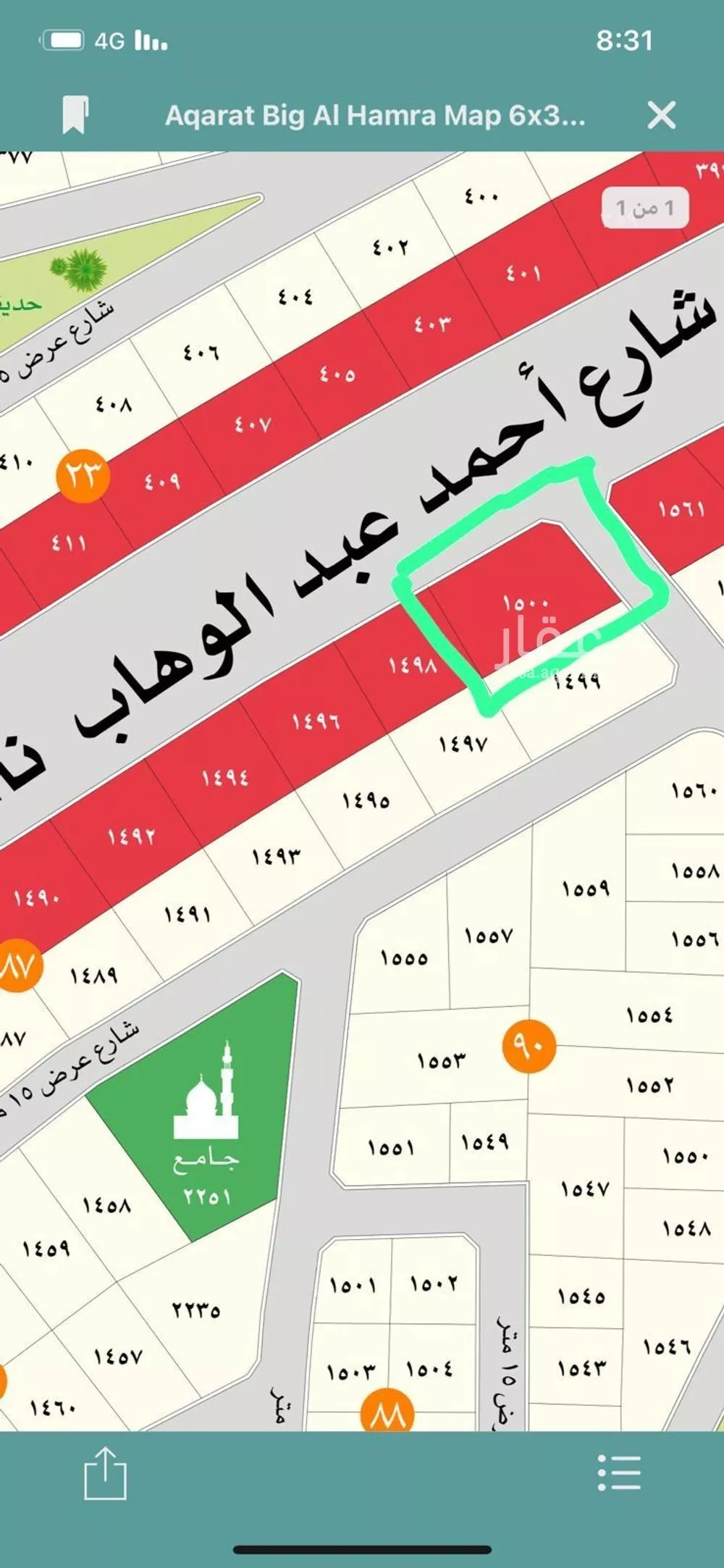 عرض على Aqarأرضين متظاهرة على طريق أحمد عبدالوهاب نائب الحرم سابقاً الدائري الثالث تجاري عرش الشارع 50 م المساحة للقطعة التجارية 1006 م والقطعة الظهيرة مساحتها 720 م المساحة الاجمالية 1726م عرض القطعة التجارية عل...