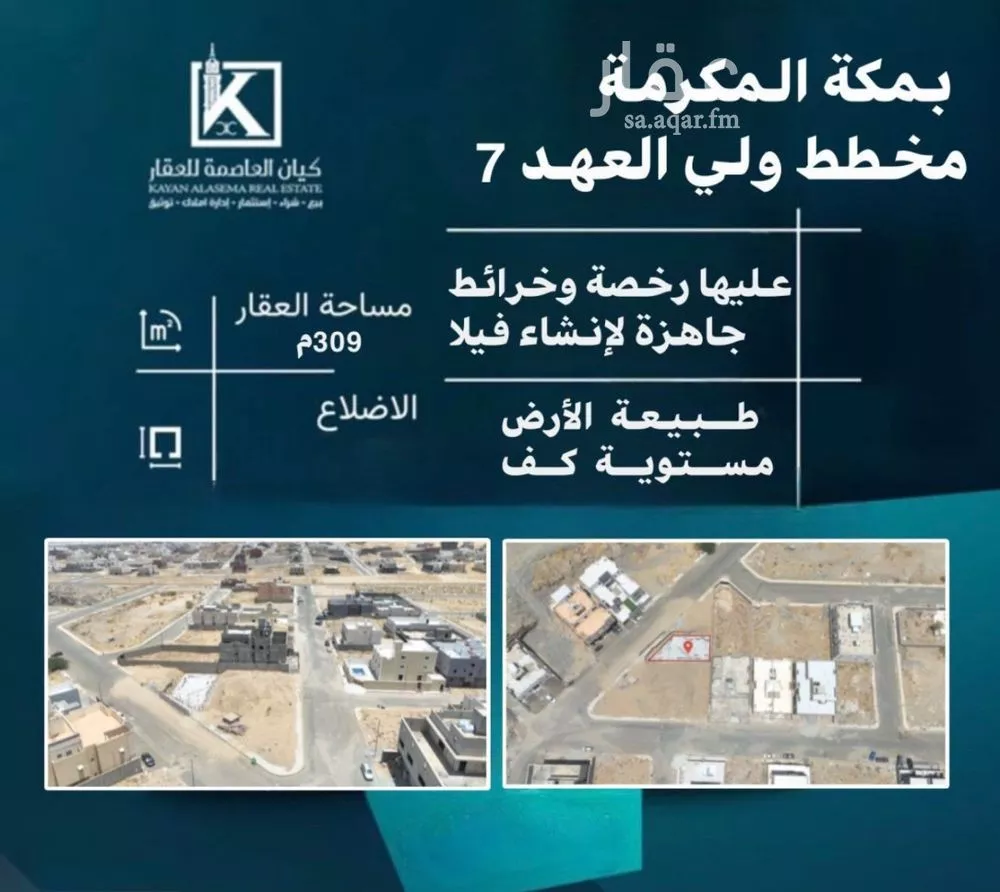 عرض على Aqarارض للبيع بمكه المكرمه مخطط ولي العهد 7 مساحتها : 309م عرض الشارع 20م واجهه جنوبية بعرض 20م طبيعه الارض مستويه كف عليها رخصه وخرائط جاهزة لاانشاء فيلا التواصل : 0555313711