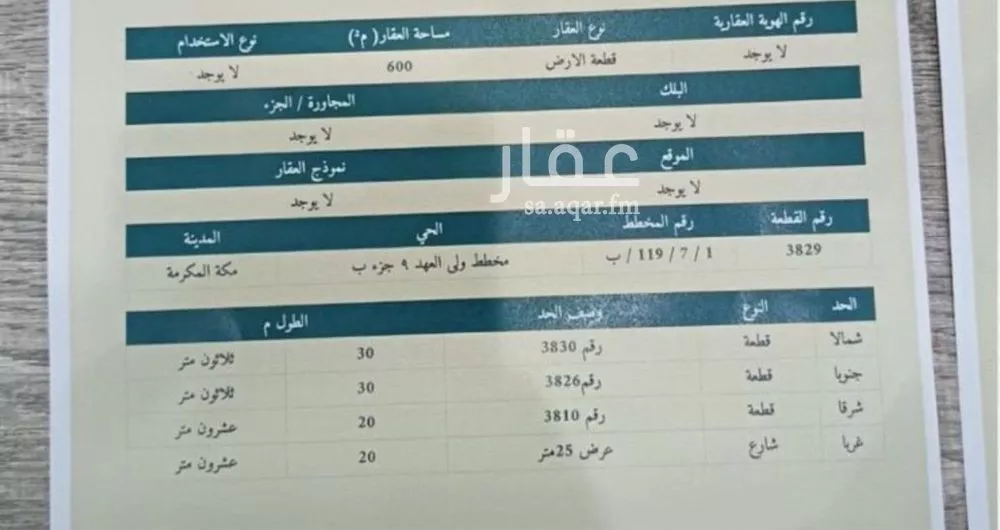 عرض على Aqarللبيع ارض مخطط وبي العهد ب مساحة ٦٠٠ شارع عرب ٢٥ متر رقم الاعلان 00945
