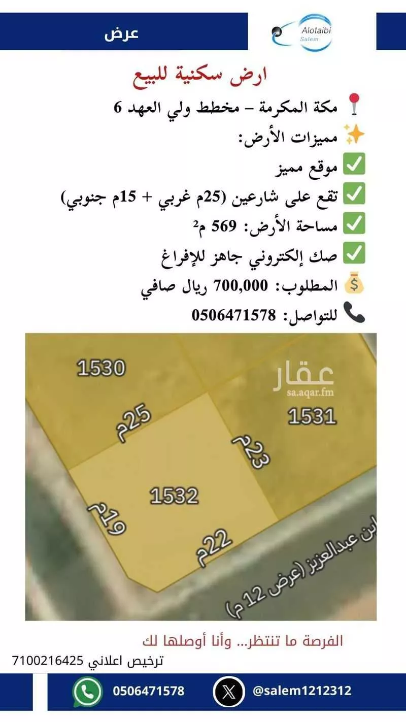 عرض على Aqarأرض سكنية للبيع � مكة المكرمة – مخطط ولي العهد 6 مميزات الأرض: موقع مميز تقع على شارعين (25م غربي + 15م جنوبي) مساحة الأرض: 569 م2 صك إلكتروني جاهز للإفراغ المطلوب: 700,000 ريال صافي للتواصل: