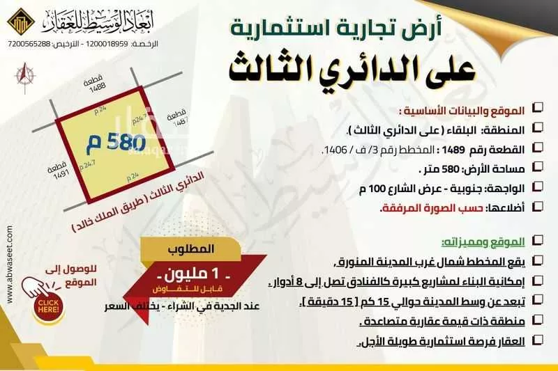 عرض على Aqarالموقع والبيانات الأساسية : المنطقة: البلقاء ( على الدائري الثالث ). القطعة رقم 1489 : المخطط رقم 3/ ف / 1406. مساحة الأرض: 580 متر . الواجهة: جنوبية - عرض الشارع 100 م أضلاعها: حسب الصورة المرفقة. ال...