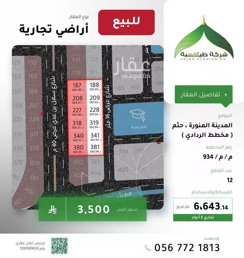 عرض على Aqarقطعة أرض تجارية المدينة المنورة حي جشم ( مخطط الردادي ) رقم اللوحة م-م-934 رقم المساحة 6643م2 بطول 120 متر على الشارع التجاري الواجهة غربي شاع عرض 40 متر + شارع 16 شرقي المطلوب 24 مليون عبارة عن عدد 1...