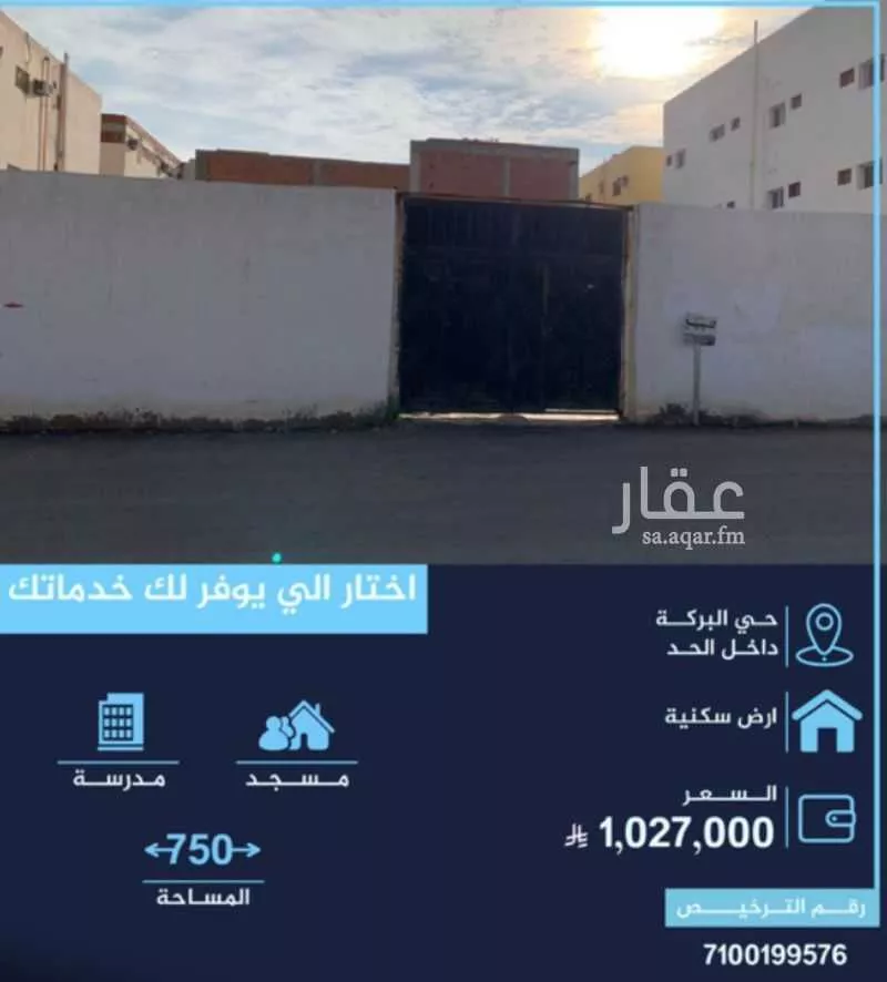 عرض على Aqarحوش سكني للبيع الموقع: المدينة المنورة حي البركة داخل الحد رقم القطعة: 75 ⏹شمالاً : قطعة بطول: 30م ⏹جنوباً : قطعة بطول 30م ⏹شرقاً : قطعة بطول 25م ⬆ غرباً : شارع 20م بطول25م المساحة: 750م السعر: مليون ...