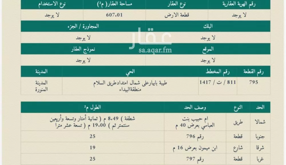 عرض على Aqarبسم الله توكلنا على الله ارض تجارية في حي طيبة السلام بالمدينة المنورة تبعد عن الحرم النبوي الشريف 7 كم . قريبة من جامعة طيبة مساحتها 607 م على واجهتين شارع 40 م شمالي الملك سعود بطول 27 م وشارع 16 شر...
