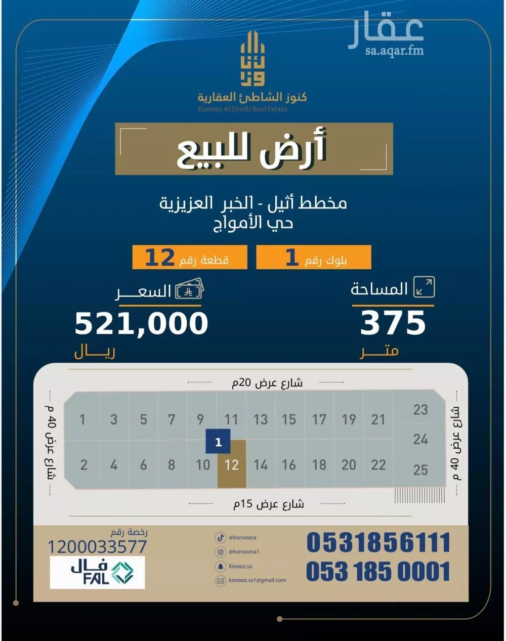 عرض على Aqarللبيع ارض في مخطط اثيل - الخبر حي الامواج مخطط مكتمل الخدمات - معتمد زفلته - شوارع - أناره - صرف صحي - ألياف بصريه موقع مميز خلف شارع العزيزيه الرئيسي افراغ فوري ــــــ رقم القطعه : 12 رقم البلوك : 1 ...