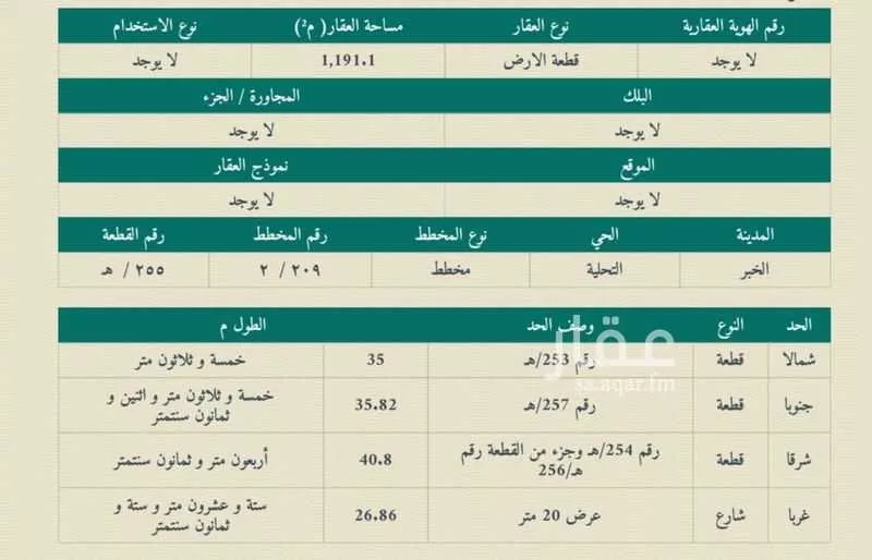 عرض على Aqarارض سكني للبيع مساحة ١١٩١.١ متر السعر للمتر ١٣٥٠ ريال غربية حي المرجان