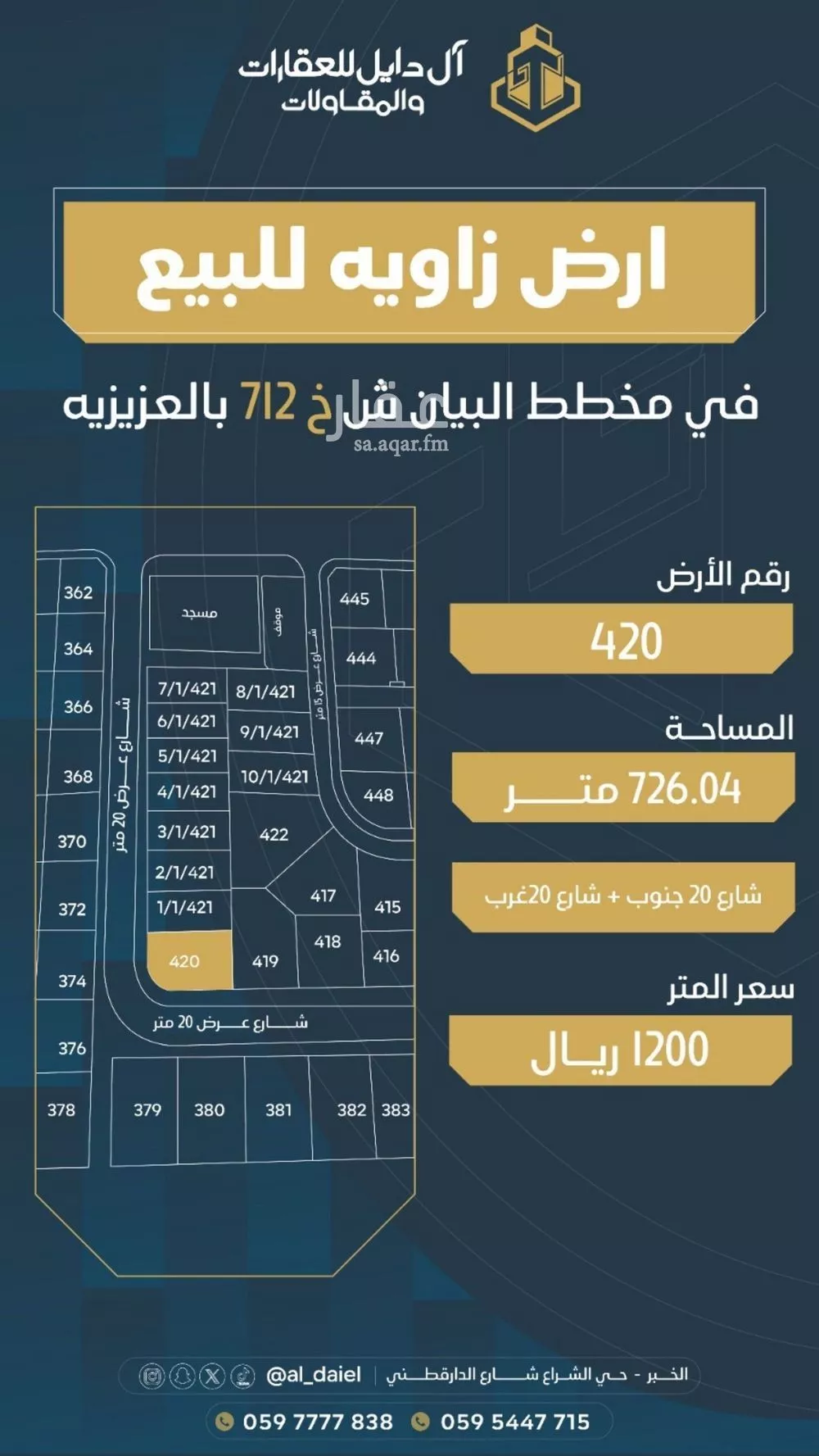 عرض على Aqarارض زاويه للبيع في مخطط البيان ش خ ٧١٢ بالعزيزيه رقم الارض ٤٢٠ مساحة الارض ٧٢٦.٠٤ متر شارع ٢٠ جنوب + شارع ٢٠ غرب المطلوب ١٢٠٠ ريال للمتر صافي غير الضريبه والسعي للاستفسار يرجي الاتصال او التواصل علي ا...