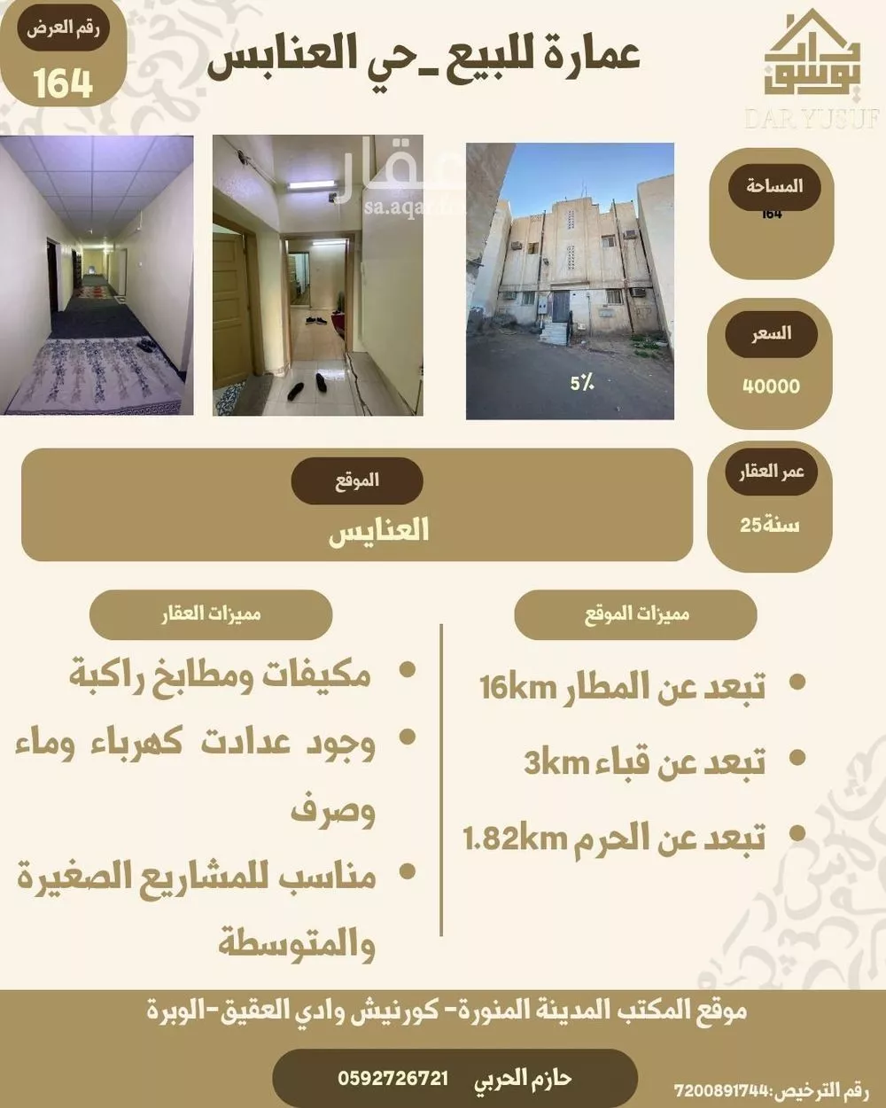 عرض على Aqarإعلان عقاري للبيع • نوع العقار: عمارة للبيع • الموقع: المدينة المنورة – حي العنابس • داخل حد الحرم • المساحة: 164 م² • عدد الأدوار: دورين • عدد الشقق: شقتين • مجموع عدد الغرف: 10 غرف • تفصيل كل شقة: •...