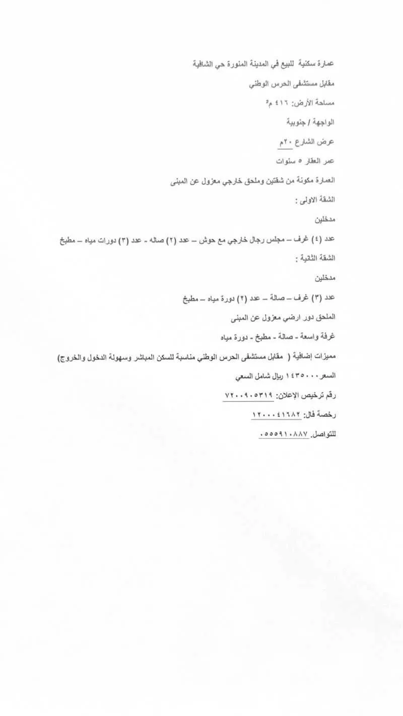 عرض على Aqarعمارة سكنية للبيع في المدينة المنورة حي الشافية مقابل مستشفى الحرس الوطني ساحة الأرض: ٤١٦ م2 الواجهة / جنوبية عرض الشارع ٢٠م عمر العقار ٥ سنوات العمارة مكونة من شقتين وملحق خارجي معزول عن المبنى الشقة...