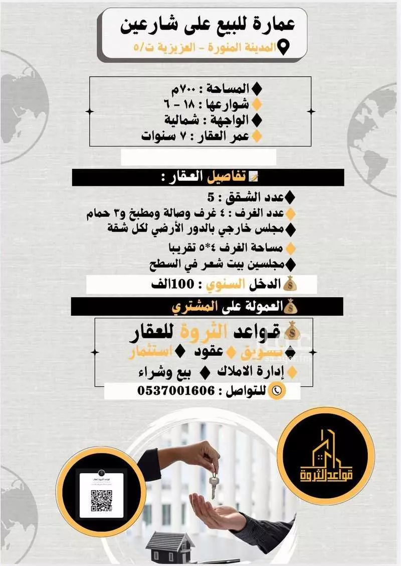 عرض على Aqar*عمارة للبيع على شارعين* المدينة المنورة - العزيزية ت/٥ ▪المساحة : ٧٠٠ م ▪شوارعها : ١٨ - ٦ ▪الواجهة : شمالية ▪عمر العقار : ٧ سنوات مساحة البناء : *تفاصيل العقار :* عدد الشقق : 5 عدد الغرف : ٤ غرف وصال...
