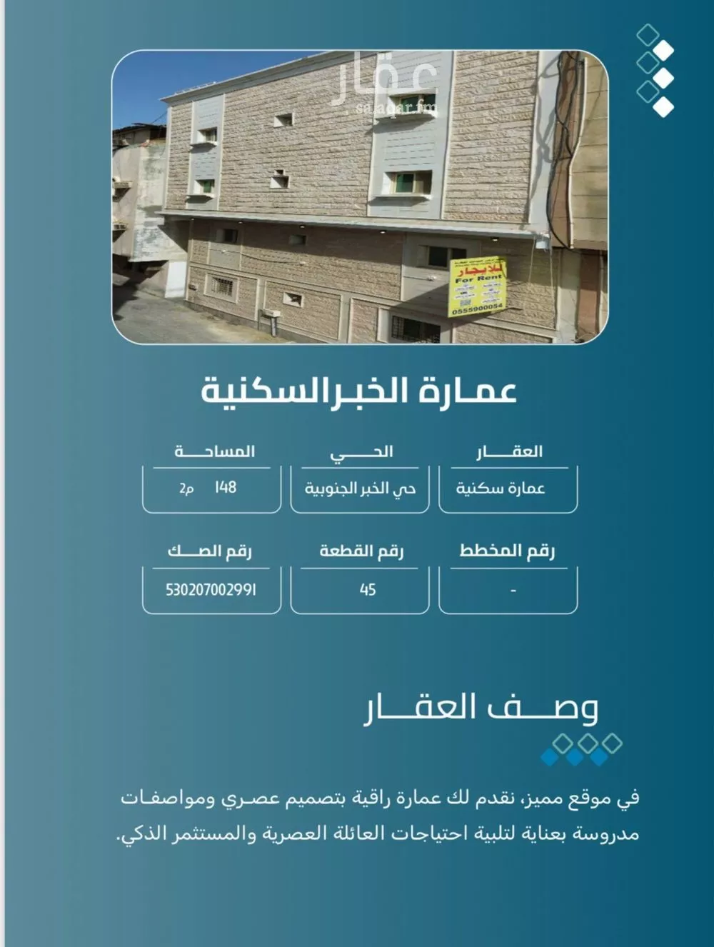 عرض على Aqarعمارة سكنية في الخبر الجنوبية على مساحة 148 م٢ تتكون من 4 أدوار كل دور يحوي على 5 استديوهات والدور الرابع مكون من استديوين. كل استوديو يحتوي على: غرفة + دورة مياة فرصة مميزة للاستثمار والتملك