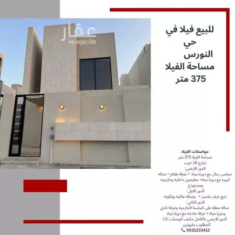 عرض على Aqarمواصفات الفيلا: مساحة الفيلا 375 متر شارع 16 غرب الدور الارضي: مجلس رجال مع دورة مياه + غرفة طعام + صاله كبيره مع دورة مياه+ مطبخين داخليه وخارجيه ومستودع الدور الاول : اربع غرف ماستر + وصاله عائليه و...