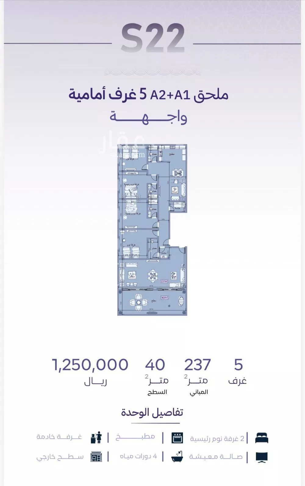 عرض على Aqarمشروع سهل 22 الواقع في حي الزهراء نعرض لكم ملحق 5 غرف امامي يتكون الملحق من 5 غرف صاله مطبخ مدخلين عداد مستقل خزان علوي وسفلي موقف خاص سطح خارجي مساحه الاجمالي 277 المباني 237م السطح 40م )مميزات المشر...