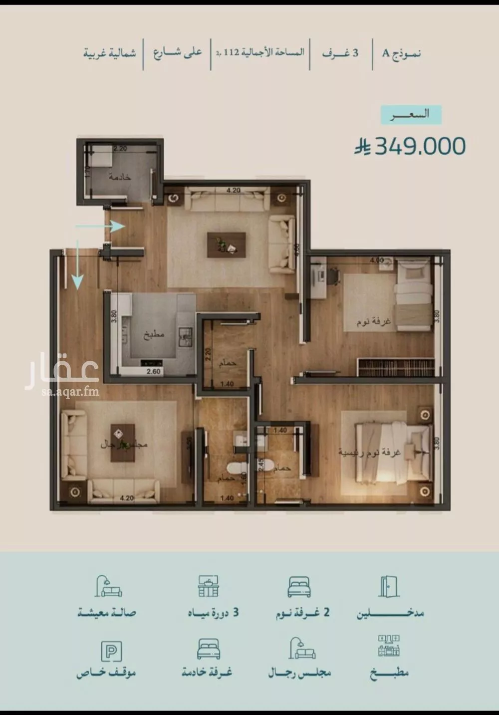 عرض على Aqarنموذج شقه 3غرف مواصفات الوحده 2غرفتين نوم مجلس رجال صاله معيشه غرفه خادمه 3دورات مياه مطبخ مدخلين للشقه موقف خاص للشقه خزانات خاصه علوي وسفلي عداد كهرباء خاص عداد مويه خاص غاز مركزي دخول ذكي