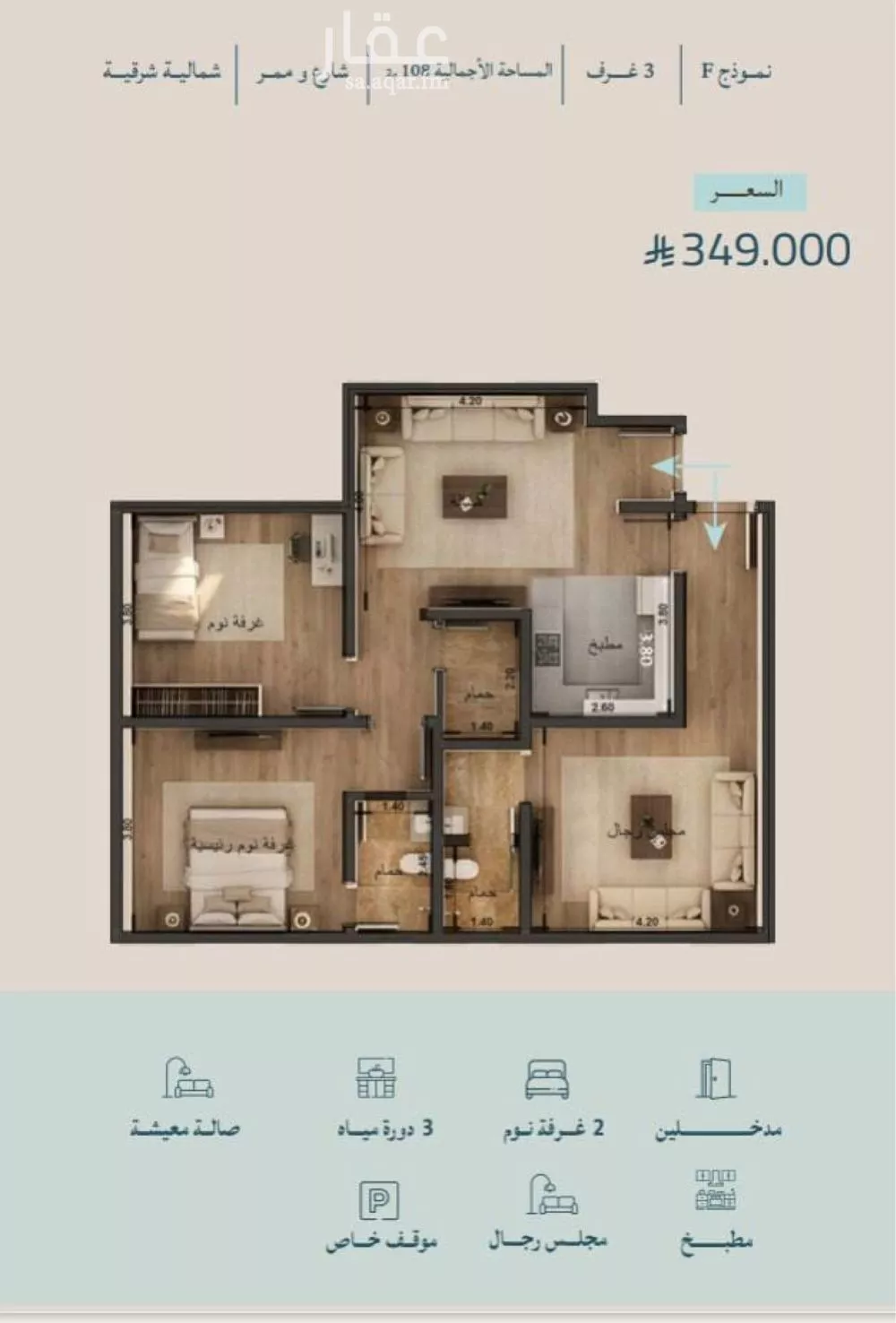 عرض على Aqarعملائنا المرام لمن اراد السكن او الاستثمار في حي الياقوت ، يعتبر المشروع نقلة نوعية في الموقع، التصميم، مجتمع سكني بمعايير حديثة. شقه ٣ غرف مدخلين - مجلس - صالة معيشه - مطبخ ٣ دورات المياه - مطبخ - مو...