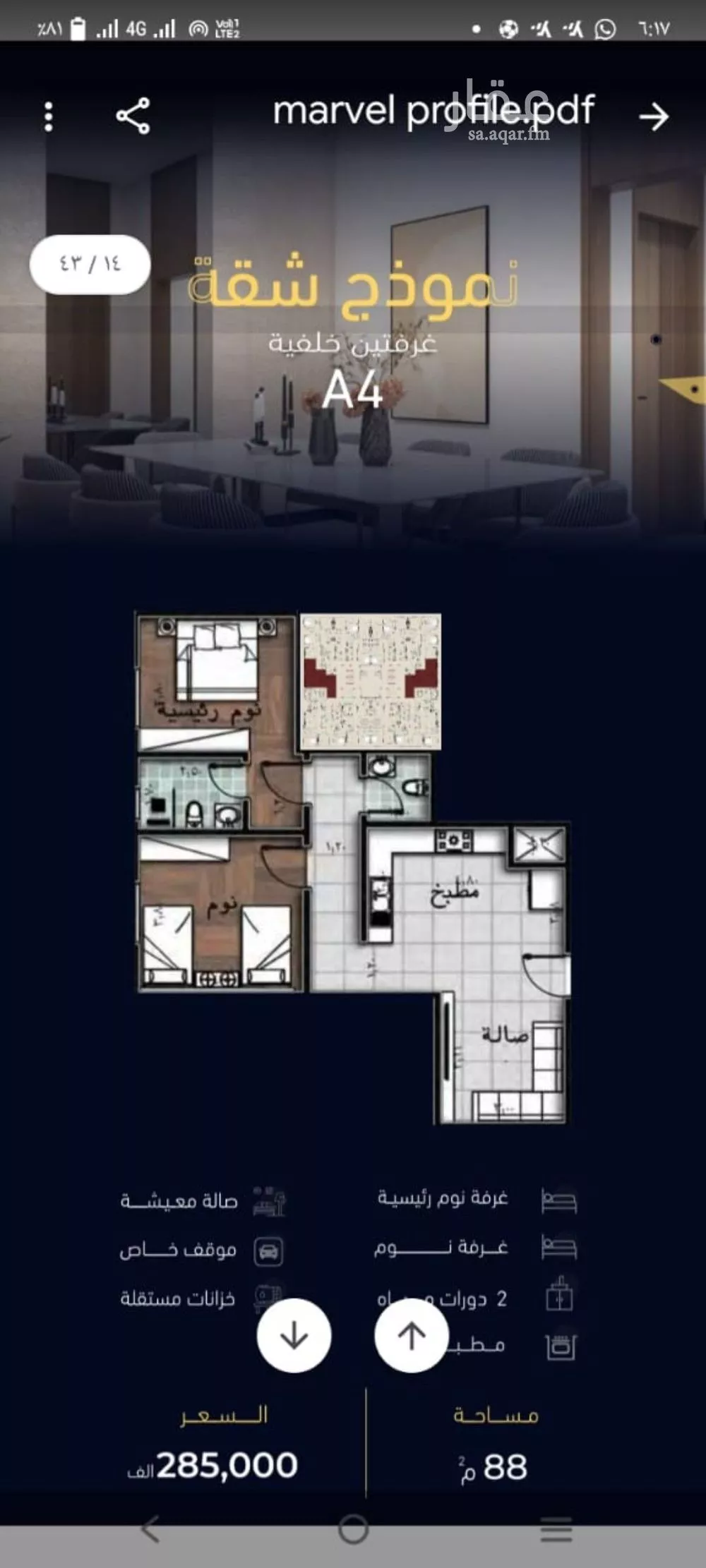 عرض على Aqarشقة غرفتين حي مشرفه المساحه 88م السعر 285 الف غرفتين مطبخ صاله معيشه دورتين مياه خزانات مستقله عدادات خاصه موقف خاص كاميرات مراقبه غاز مركزي تصميم مودرن مداخل فندقيه ضمانات تصل الى 25 سنه موقع مميز با...