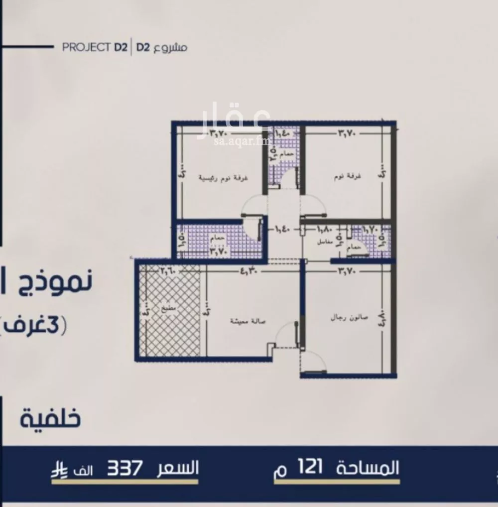 عرض على Aqarنموذج شقه 3غرف غرفتين نوم مجلس رجال صاله معيشه مطبخ 3دورات مياه موقف خاص للشقه عداد كهرباء خاص عداد مويه خاص خزانات خاصه علوي وسفلي دخول ذكي كاميرات مراقبه غاز مركزي مشروعًا سكنيًا يضع راحتك وأمانك في...