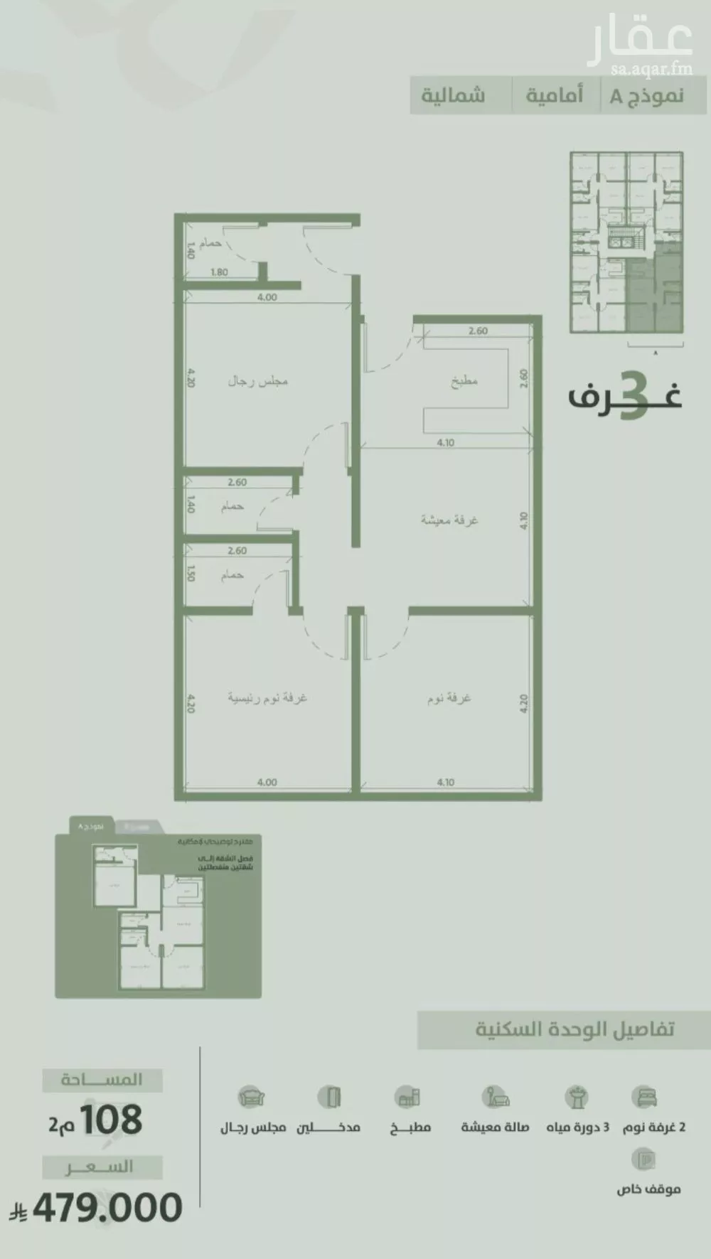 عرض على Aqarشقه 3غرف اماميه حي السلامه مكونات الوحده 2غرفة نوم مجلس رجال صالة معيشة مطبخ 3دورات مياه مدخلين للشقه موقف خاص خزان علوي وسفلي خاص عداد كهرباء خاص عداد موية خاص
