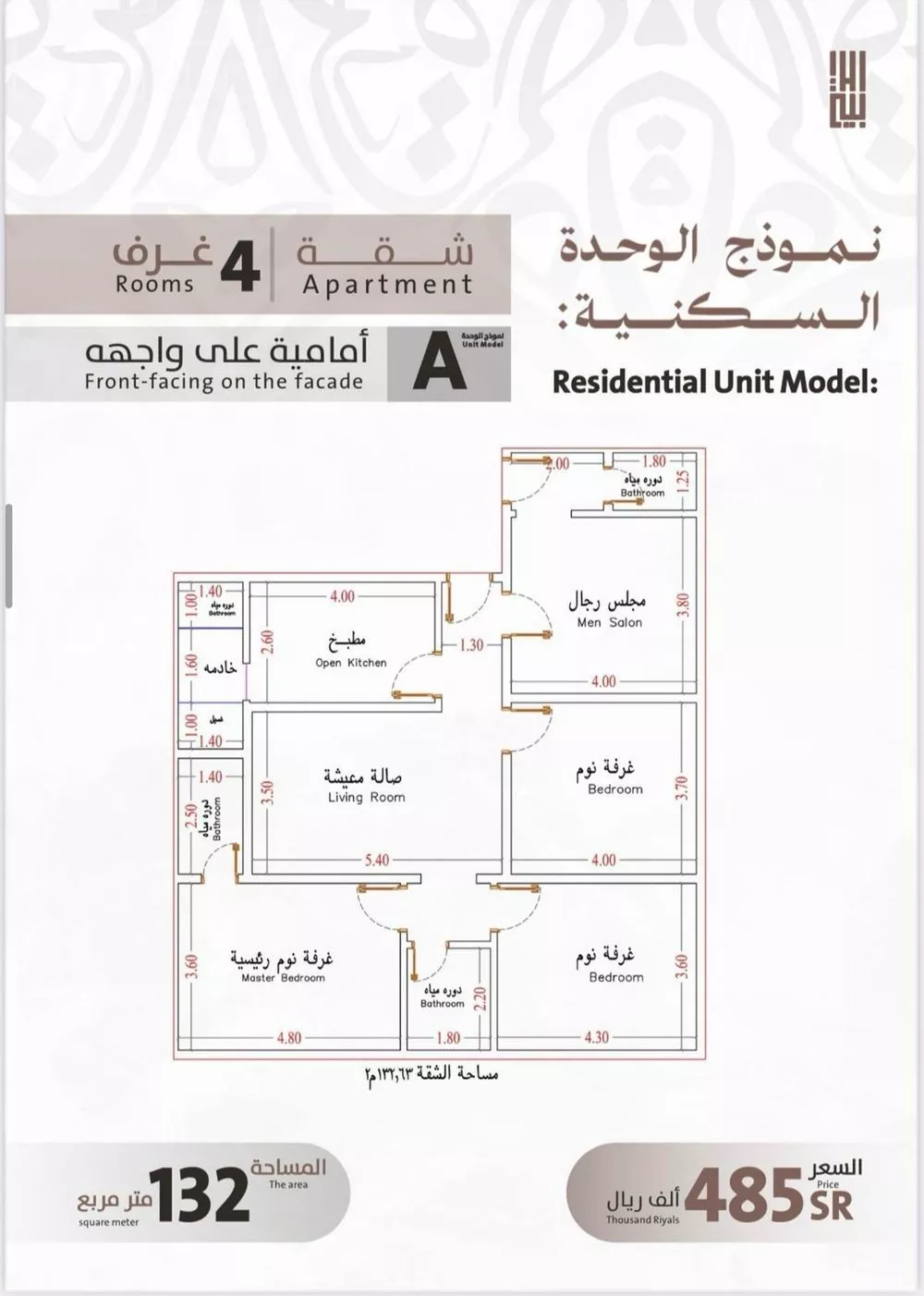 عرض على Aqarشقة 4 غرف امامية + غرفة خادمة + غرفة غسيل . بمساحة132م بسعر 485 الف كاش