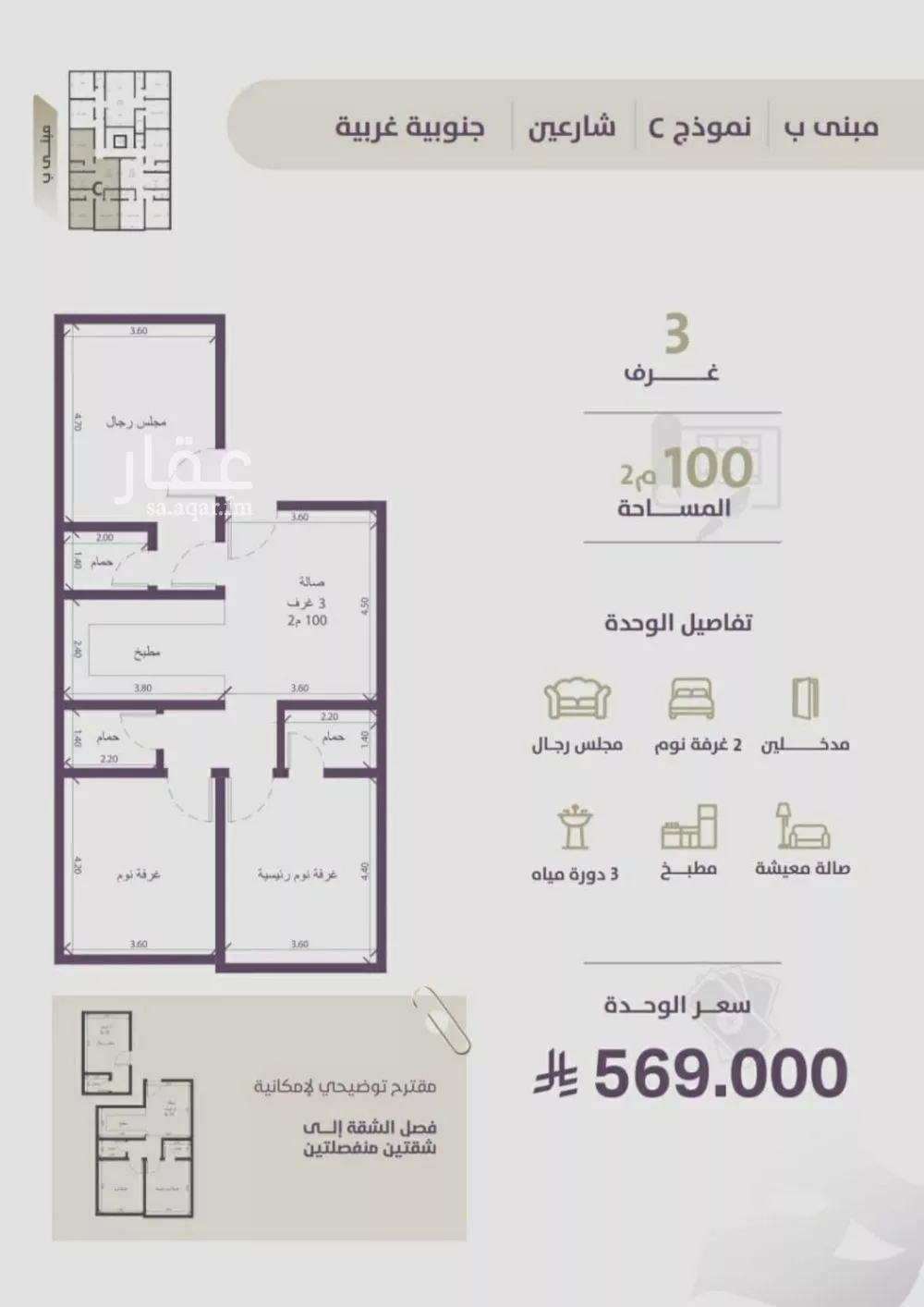 عرض على Aqarالسلام عليكم ورحمه الله تملك واستثمر في ارقى احياء جده عرضنا اليوم شقه 3/غرف بمساحه 100م وبسعر569 الف تفاصيل الشقه مدخلين غرفتين نوم مجلس رجال صاله معيشه مطبخ 3/دورات مياه مميزات الشقه دخول ذكي غاز مر...