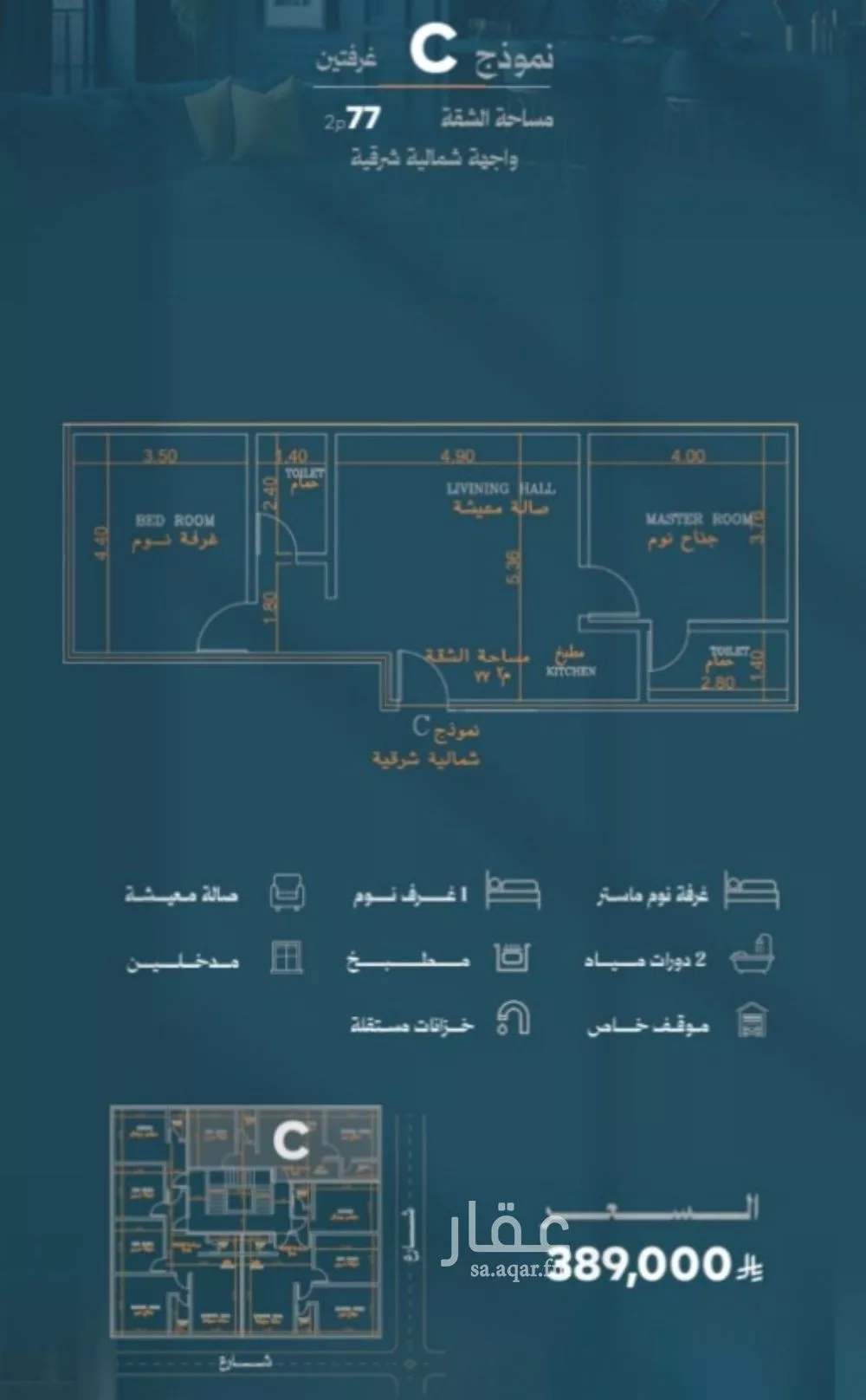 عرض على Aqarللبيع شقة تصميم عملي وموقع مميز شقة مميزة بواجهة شمالية شرقية المساحة: 77 م² السعر: 389,000 ريال تفاصيل الشقة: غرفة نوم ماستر غرفة نوم إضافية صالة معيشة مريحة مطبخ عملي 2 دورات مياه مدخلين خزانات مستق...