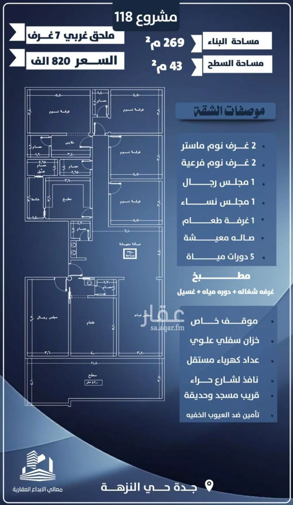 عرض على Aqarيسرنا أن نضع بين أيديكم مشروعنا ال١١٨ الكائن بحي النزهة قيد الانشاء تفاصيل الشقه ملحق فاخر (إجمالي المساحة312متر ²) مباني 263 سطح 43 م² السعر 820 الف تفاصيل الوحدة: 7غرف. مجلس رجال مستقل مع دورة مياه ...