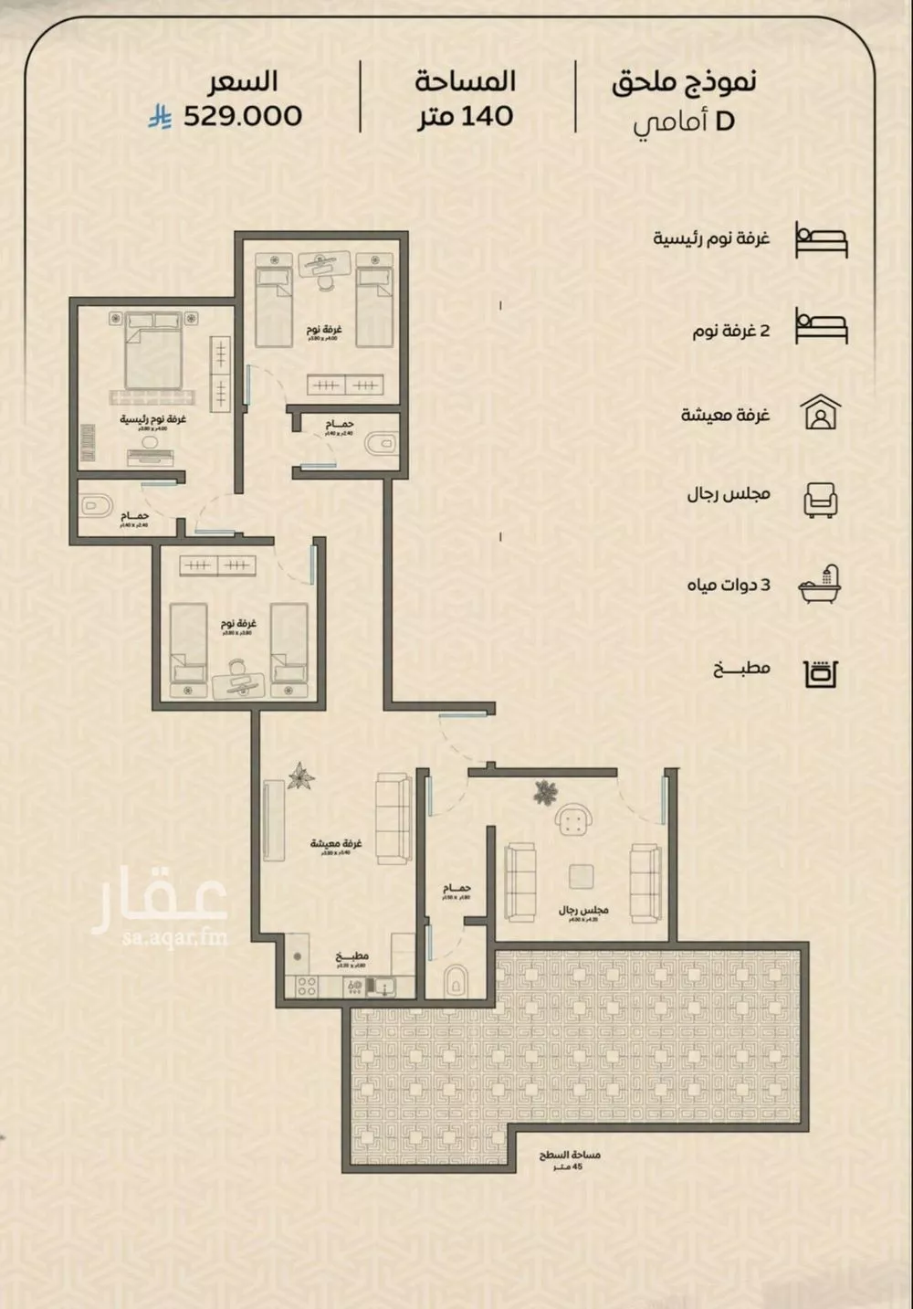 عرض على Aqarشقة 4 غرف المساحة 140م السعر 529 الف