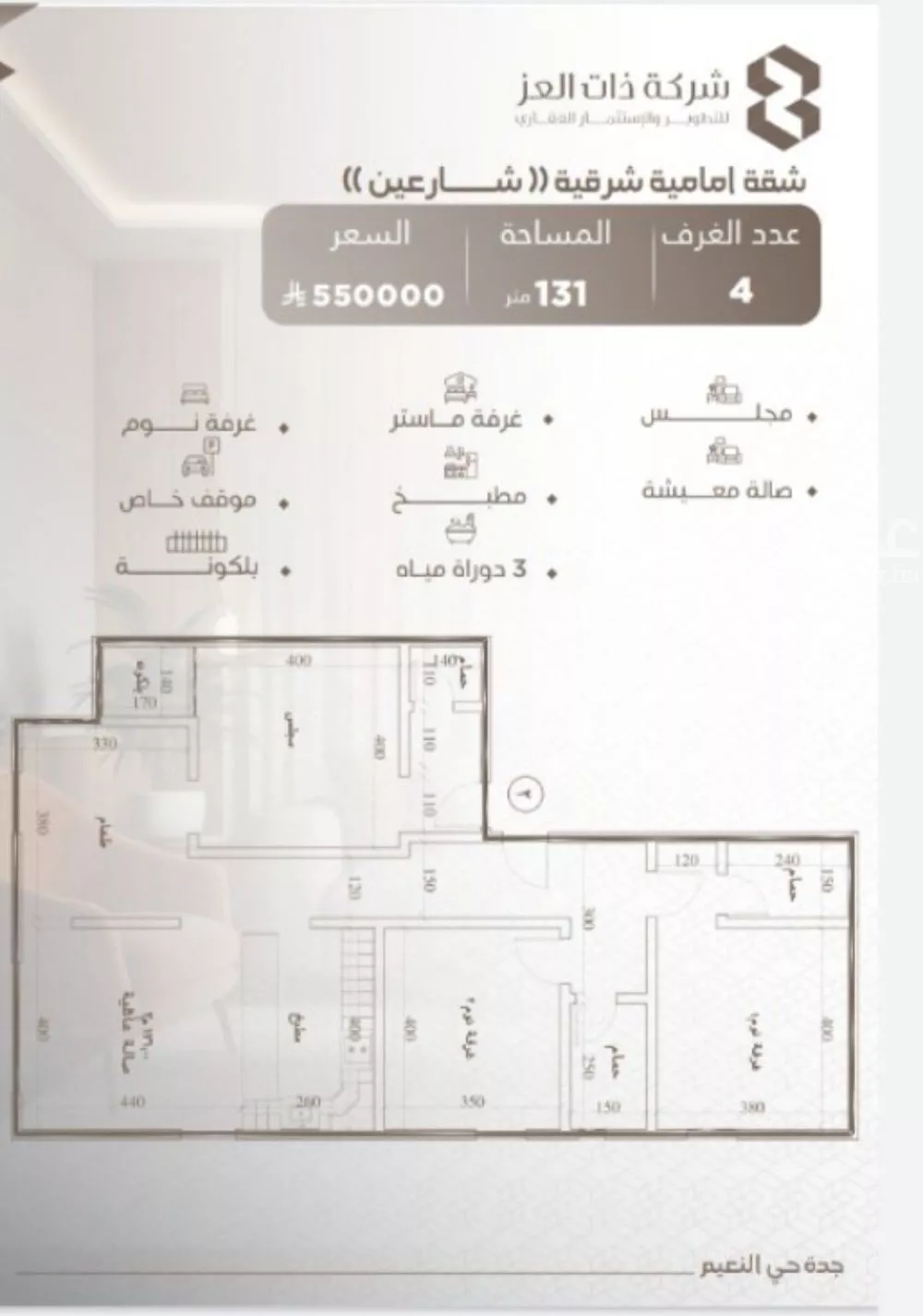 عرض على Aqarالسلام عليكم ورحمة الله وبركاته ▫شقق 4 غرف بمساحة 136 على شارع: مدخلين مجلس صالة معيشه مطبخ ٣دورات المياه موقف خاص خزانات مستقله *550,000 ريال*