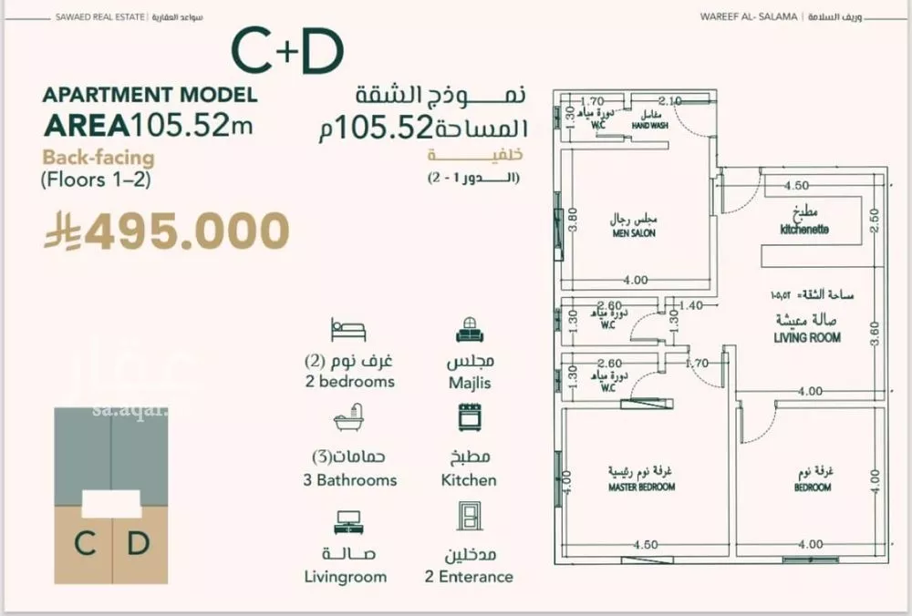 عرض على Aqarحي السلامة .. ⚜ حيث يقع المشروع على شارع تجاري بعرض 25م شمالي.. شقة تتكون من: ثلاث غرف خلفية نموذج C - D بمساحة(١٠٢م) بسعر 495الف ----------- - " "ولأي استفسار إضافي، يشرفنا تواصلكم ويُسعدنا خدمتكم." ...
