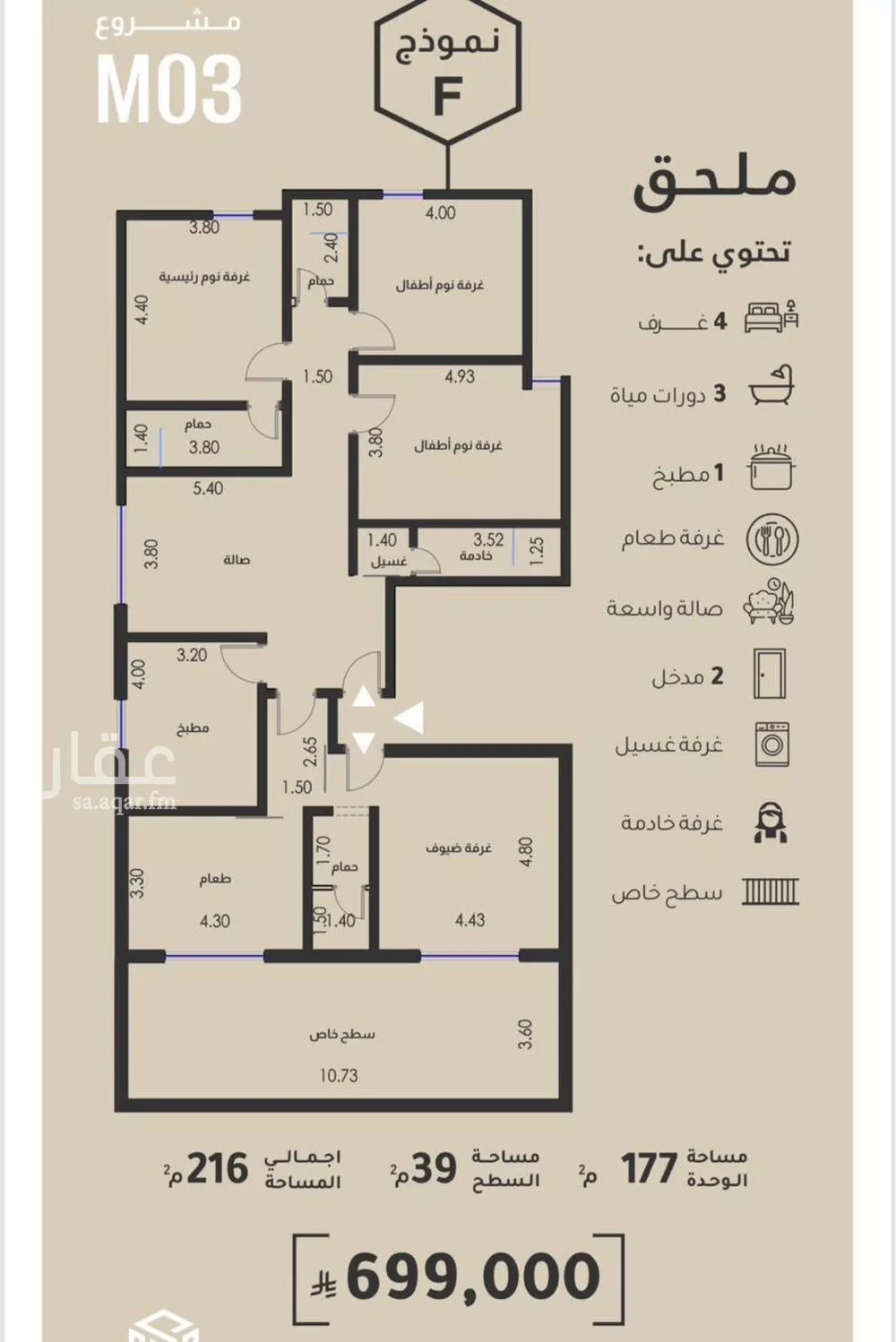 عرض على Aqarملحق 5 غرف المساحة 216م السعر 699,000