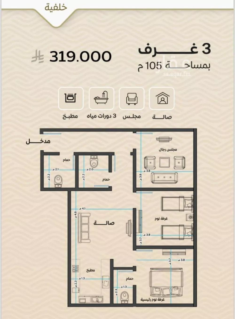 عرض على Aqarالسلام عليكم ورحمه الله وبركاته نضع بين ايديكم شقه 3غرف السعر 319 الف تشطيبات فاخرة مساحات متنوعة تبدّا من 80م-140م مميزات الموقع: • مسجد الحي على بُعد 100 م • ♂ 550 م عن شارع الملك فهد • ♂ 850 م عن ش...