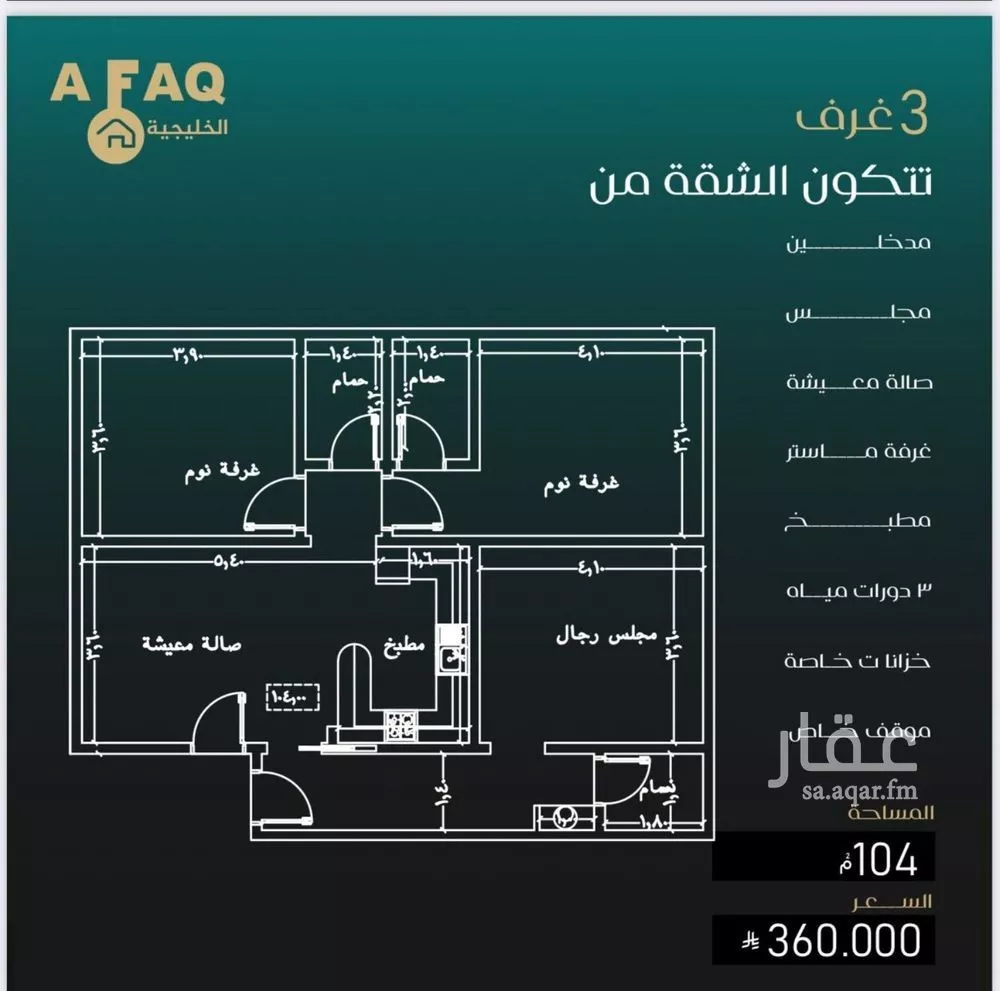 عرض على Aqarثلاث غرف كاش فقط حي النزهه مدخلين وصاله ومطبخ وثلاثه دورات مياه بسعر 360 الف فقط *مميزات الــمشروع* *تشطيبات فاخره وعصريه *مساحات جدآ مختلفه تناسب احتياجات المستثمر والساكن *دخول ذكي (سمارت هوم) *مدخل...