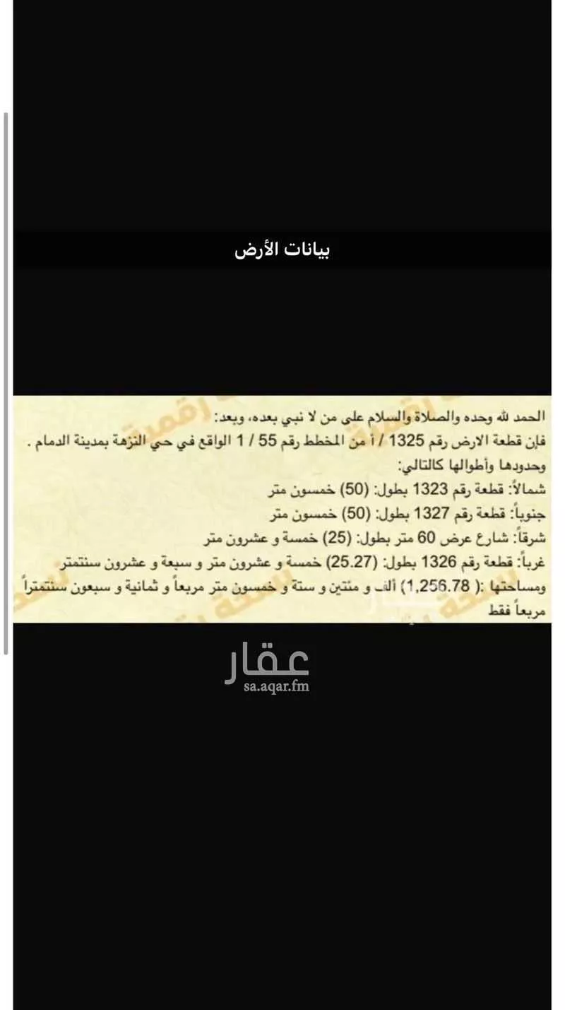 عرض على Aqarللبيع من المالك مباشرة (التواصل عبر واتساب) المساحة ١٢٥٦ متر سعر المتر ٢١٠٠ ريال الإجمالي: ٢٦٣٧٦٠٠ ريال أبعاد الأرض: شمال ٥٠ متر جنوب ٥٠ متر شرق: ٢٥ متر (شارع بعرض ٦٠ متر) غرب: ٢٥.٢٧ متر الأرض تقبل ال...