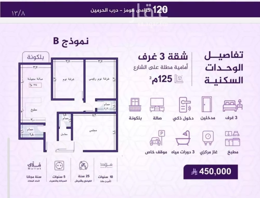 عرض على Aqar3 غرف مشروع درب الحرمين المساحة: 125م 3 غرف صالة واسعة مطبخ ثلاث دورات مياه مدخلين مستقلين دخول ذكي غاز مركزي موقف خاص خزان مستقل ضمن مشروع درب الحرمين بلكونه السعر: 450