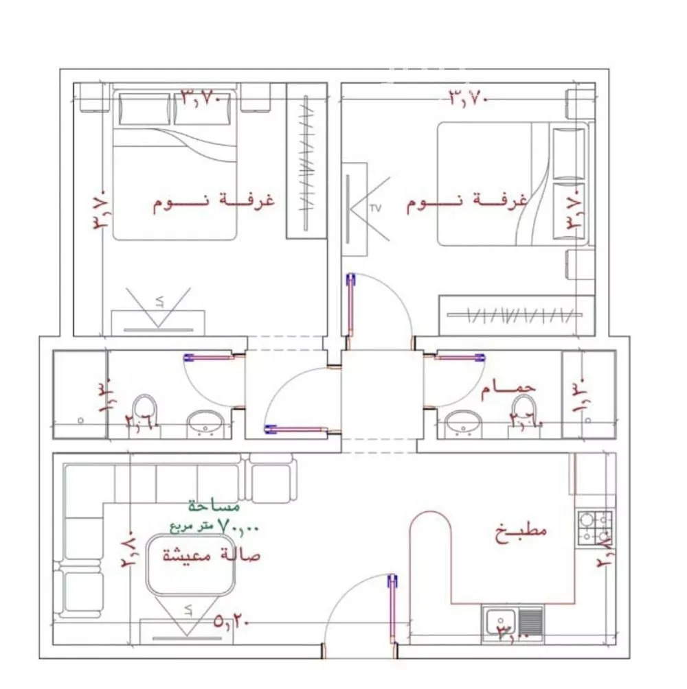 عرض على Aqarالشقة مساحتها 70 م² وسعرها 275 ألف، وهي شقة غرفتين نوم + صالة + مطبخ + حمامين. التوزيع العام للشقة عند النظر للمخطط، الشقة مقسومة إلى قسمين: الجزء السفلي: الصالة والمطبخ والمدخل الجزء العلوي: غرف النو...