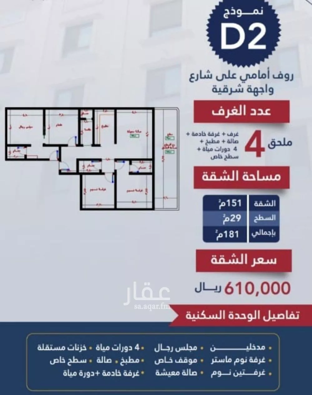 عرض على Aqarشقق للبيع للسكن والاستثمار في ارقى احياء جده حي النسيم موقع مميز قريب من جميع الخدمات ملحق 4 غرف مساحة 181م بسعر 610 الف 3 دورات مياه صاله مطبخ موقف خاص خزانات مستقله