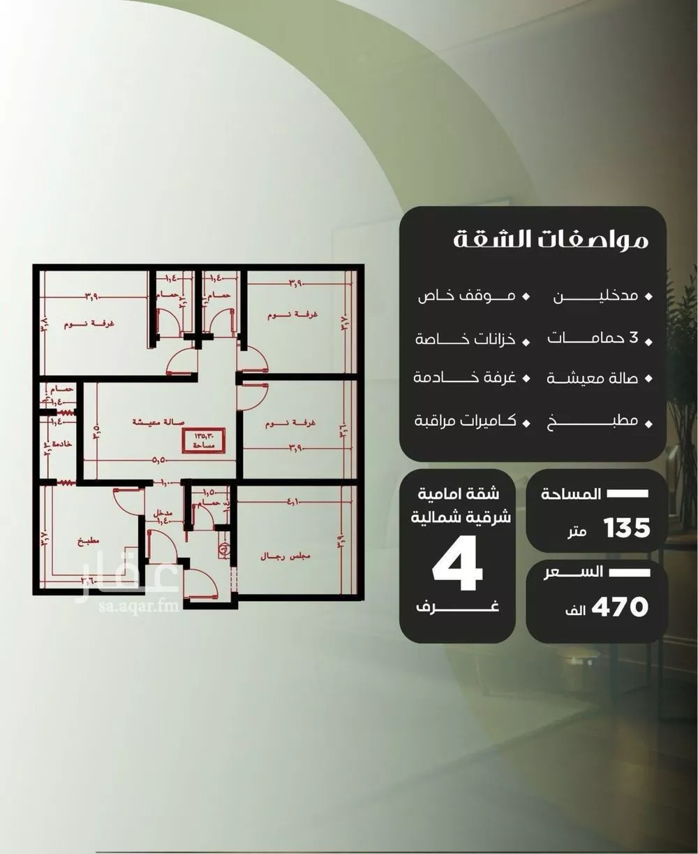 عرض على Aqarالسلام عليكم ورحمة الله وبركاته شقه للتمليك في * *حي* *النــــــــزهه* *المكونه من* : *اماميه شارع* *4 غرف* ٠ *المساحة* *135* م *السعر* *470* *ألف ريال* *كاميرات مراقبة* *دخول ذكي* *شبابيك واسعه* *اسق...