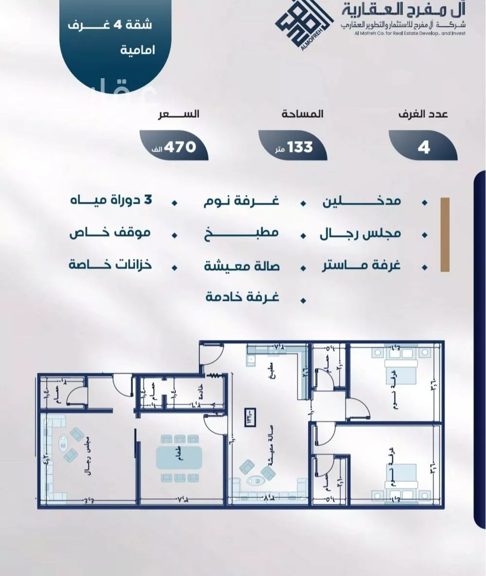 عرض على Aqarشقة*4غرف (أمامية شارع)* *المساحة 133م* **السعر* *470* *ألف*
