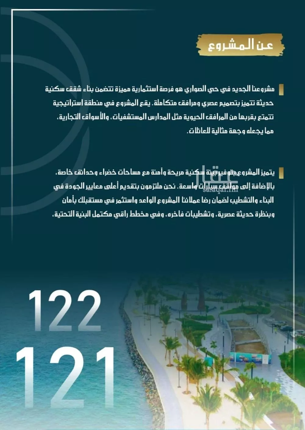 عرض على Aqarالسلام عليكم ورحمة الله وبركاته نقدم لكم مشروعنا الجديد رقم 124 الواقع في حي الصواري طريق الأمير عبدالمجيد مقابل الحديقه واجهه شمالي غربي بمساحات مختلفة يتكون المشروع الواجهه شمالي غربي 4غرف*اماميه شا...