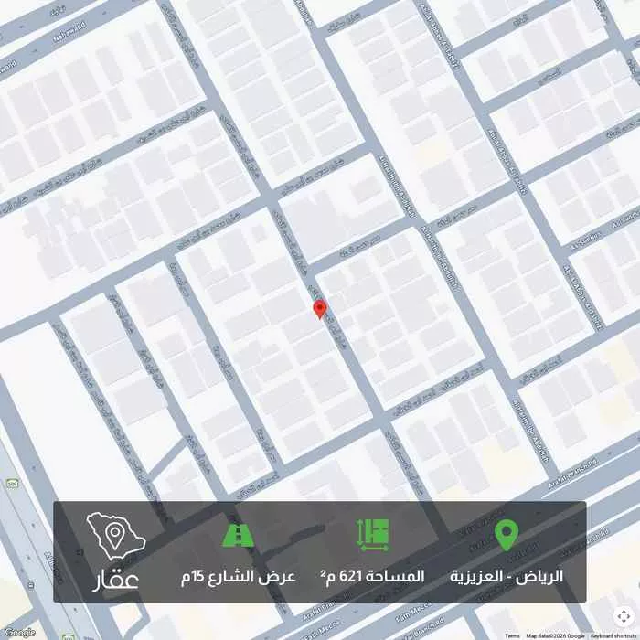 621 م² أرض في العزيزية، الرياض معروضة بسعر ١٬١١٧٬٨٥٤ ريال، أقل بنسبة 45% من متوسط سعر الحي البالغ ٢٬٠٢٥٬٠٠٠ ريال. بناءً على 27 عقار مشابه.