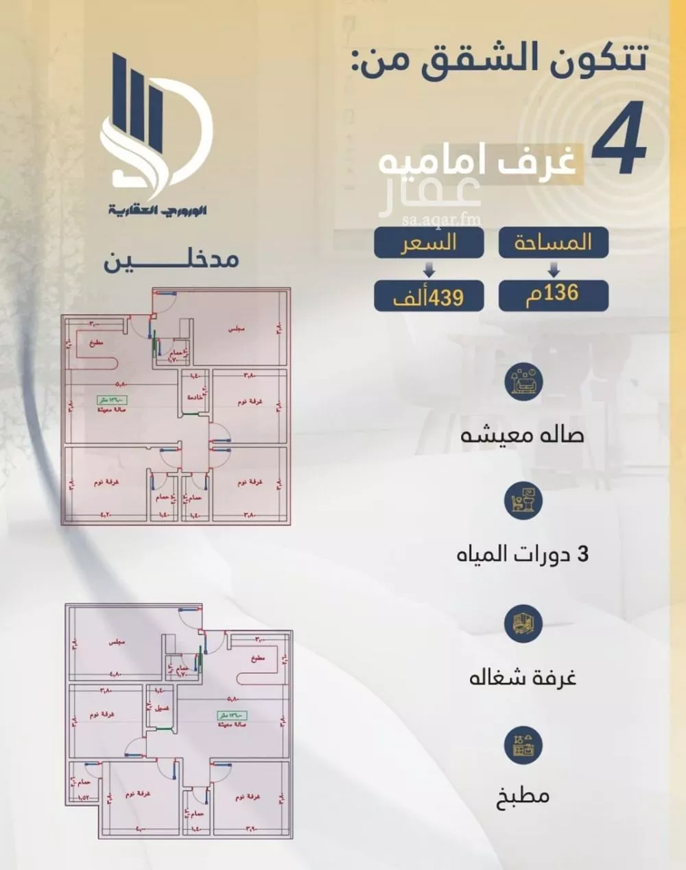 عرض على Aqar••أعزاءنا شركاء النجاح• • تقدم لكم مشروعنا الجديدة《107 》الواقع بحي الواحه مخطط سندس مقابل الواحه بوليفارد مباشره [ مــشـــروع 107 ] على شارع 20م واجهة غربيه 《 4غرف امامية 》 《 مدخلين 》 《 صاله معيشه 》 《...