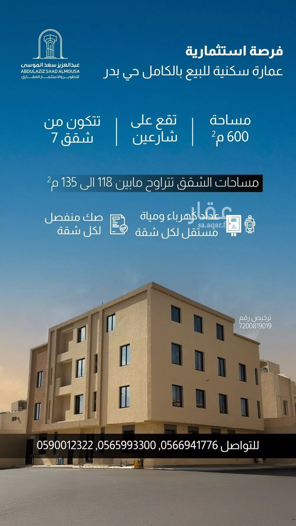 عرض على Aqar1-للبيع في حي بدر شقق تمليك 7 شقق كل شقه بالعداد كهرب ومويه مستقل المساحات تبدا من 118 الى 135 كل شقه ثلاث غرف نوم ومجلس وصاله وثلاث دورات مياه 2-عرض البيع العماره كامله مساحتها كاملة 600 والبيع 3,550...