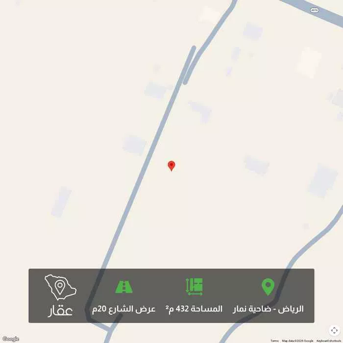 432 م² أرض في ضاحية نمار، الرياض معروضة بسعر ١٧٬٤٠٠ ريال، أقل بنسبة 98% من متوسط سعر الحي البالغ ٧٥٦٬٦٠٠ ريال. بناءً على 438 عقار مشابه.